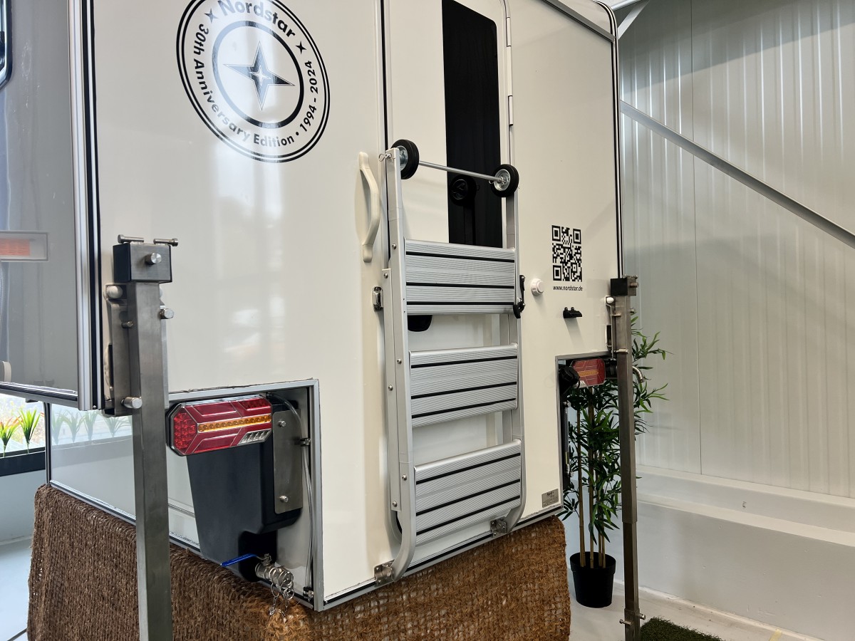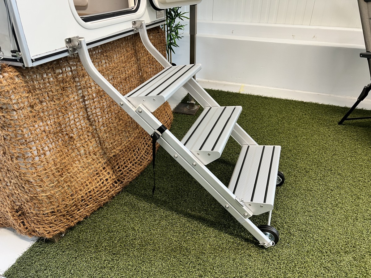 Da sich die Wohnkabine durch das zusätzliche Gewicht beim Betreten in der Regel leicht absenkt, haben wir für den Ausgleich am Ende der Treppe zwei Rollen angebracht. So kann die Treppe vor- und zurückrollen, um den Höhenunterschied flexibel auszugleichen.